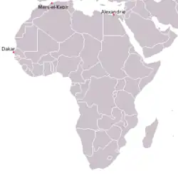 Following the 3 July operation, Darlan ordered the French fleet to attack Royal Navy ships wherever possible; Pétain and his foreign minister Paul Baudouin over-ruled the order the next day. Military retaliation was conducted by ineffective air raids on Gibraltar but Baudouin noted, "the attack on our fleet is one thing, war is another". As sceptics had warned, there were also complications with the French empire; when French colonial forces defeated de Gaulle's Free French Forces at the Battle of Dakar in September 1940, Germany responded by permitting Vichy France to maintain its remaining ships armed, rather than demobilised.[48] On 24 September Gibraltar was bombed by sixty Vichy French aircraft which dropped 45 long tons (46 t) of bombs and that night, another 81 bombers dropped 60 long tons (61 t) of bombs. The French 2nd Destroyer Division comprising Fougueux, Frondeur, Épée and Fleuret had sailed from Casablanca on 24 September and in the early hours of 25 September encountered the destroyer Hotspur patrolling off Gibraltar. Épée opened fire but its 13 cm (5.1 in) guns broke down after firing fourteen shells, Fleuret did not open fire because it could not get on target and the other French destroyers fired six shots between them. Hotspur returned fire but this was not reported by the French ships.[49]