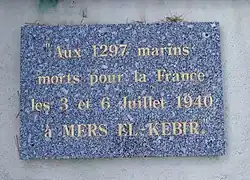 The attack on Mers-el-Kébir (Battle of Mers-el-Kébir) on 3 July 1940, during the Second World War, was a British naval attack on French Navy ships at the naval base at Mers El Kébir, near Oran, on the coast of French Algeria.[3][a] The attack was the main part of Operation Catapult, a British plan to neutralise or destroy French ships to prevent them from falling into German hands after the Allied defeat in the Battle of France. The British bombardment of the base killed 1,297 French servicemen, sank a battleship and damaged five other ships, for a British loss of five aircraft shot down and two crewmen killed. The attack by air and sea was conducted by the Royal Navy, after France had signed armistices with Germany and Italy, coming into effect on 25 June.