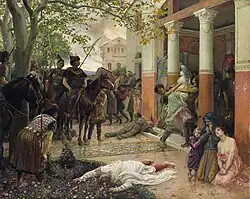 Attila responded with a campaign in 443.[33] For the first time (as far as the Romans knew) his forces were equipped with battering rams and rolling siege towers, with which they successfully assaulted the military centers of Ratiara and Naissus (Niš) and massacred the inhabitants. Priscus said "When we arrived at Naissus we found the city deserted, as though it had been sacked; only a few sick persons lay in the churches. We halted at a short distance from the river, in an open space, for all the ground adjacent to the bank was full of the bones of men slain in war."[34]