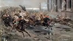 Attila's sons Ellac, Dengizich and Ernak, "in their rash eagerness to rule they all alike destroyed his empire".[21]: 259 They "were clamoring that the nations should be divided among them equally and that warlike kings with their peoples should be apportioned to them by lot like a family estate".[21]: 259 Against the treatment as "slaves of the basest condition" a Germanic alliance led by the Gepid ruler Ardaric (who was noted for great loyalty to Attila[21]: 199 ) revolted and fought with the Huns in Pannonia in the Battle of Nedao 454 AD.[21]: 260–262 Attila's eldest son Ellac was killed in that battle.[21]: 262 Attila's sons "regarding the Goths as deserters from their rule, came against them as though they were seeking fugitive slaves", attacked Ostrogothic co-ruler Valamir (who also fought alongside Ardaric and Attila at the Catalaunian Plains[21]: 199 ), but were repelled, and some group of Huns moved to Scythia (probably those of Ernak).[21]: 268–269 His brother Dengizich attempted a renewed invasion across the Danube in 468 AD, but was defeated at the Battle of Bassianae by the Ostrogoths.[21]: 272–273 Dengizich was killed by Roman-Gothic general Anagast the following year, after which the Hunnic dominion ended.[8]: 168