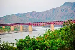 Attock is located east of the Indus River, in the Pothohar Plateau, Geographically, the district is mainly hills, plateaus and river/stream dissected plains. The Indus River flows on the Northern and Western borders of the district. After Haripur, the Haro River passes through the North of the tehsil of Attock where there is a floodplain with fertile soil between 2 mountain ranges, this is where Attock city itself is located.[10] Elevation varies with many of the plains being 300-600m above sea level while the hills and ranges reach upwards of 1200m above sea level. The range south of the city is called the Kala Chitta Mountain Range while the one north of the city is known as the Gandghar Range.[11]
