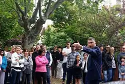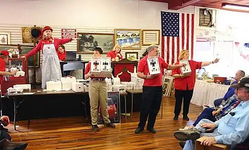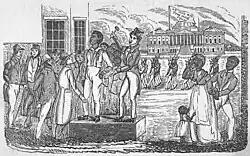 As already mentioned in the history section, auctions have been used to trade commodified people from the very first. Auctions have been used in slave markets throughout history until modern times in the post-Gaddafi era Libya.[89][90][91] The word for slave auction in the Atlantic slave trade was scramble. A child auction is a Swedish and Finnish historical practice of selling children into slavery-like conditions by authorities using a descending English auction.[92] Fattigauktion is a similar Swedish practice involving poor people being auctioned to church organizations.[93] Trade of wives by auctions was also a common practice throughout history. For instance, in the old English custom of wife selling, a wife was divorced by selling her in a public auction for the highest bid.[94] ISIS conducted slave auctions to sell up to 7,000 Yazidi women as reported in 2020.[95][96]