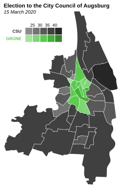 The Augsburg city council governs the city alongside the Mayor. The most recent city council election was held on 15 March 2020, and the results were as follows: