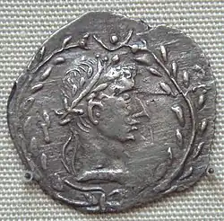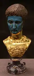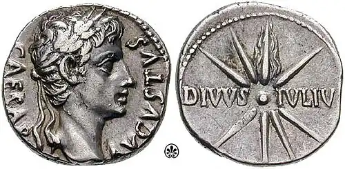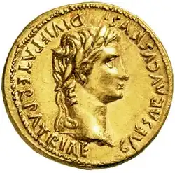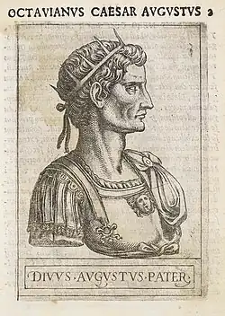- Imperator Caesar ('Commander-in-Chief Caesar'):[18] Octavian's early coins and inscriptions all refer to him simply as Gaius Caesar, but by 38 BC he had replaced Gaius with the victory title imperator ('commander').[19][d] The use of imperator signified a permanent link to the Roman tradition of victory.[20][e] His new family line would continue the use of the name Caesar, a cognomen for one branch of the Julian family, and eventually this would form a standard imperial title.[22] Occasionally the epithet divi filius or divi Iuli(i) filius 'son of the divine Julius' was included, alluding to Julius Caesar's deification in 42 BC.[23]