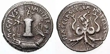 Sextus Pompeius threatened Octavian in Italy by denying shipments of grain through the Mediterranean Sea to the peninsula.[244] Pompeius's own son was put in charge as naval commander in the effort to cause widespread famine in Italy.[245] Pompeius's control over the sea prompted him to take on the name Neptuni filius ('son of Neptune').[246] Before the battles of Philippi, Octavian had sent Salvidienus Rufus with a naval force to dislodge Sextus Pompeius from Sicily, but without success, and so the triumvirs recognized his command over the sea with the Treaty of Brundisium in 40 BC.[247] However, when Sextus Pompeius resumed his blockade, a starving angry mob in Rome blamed Octavian and Antony and attacked them in early 39 BC; Antony's forces rescued Octavian and dispersed the mob.[248] Another temporary peace agreement was reached in 39 BC with the Pact of Misenum. The blockade on Italy was lifted once Octavian granted Pompeius Sardinia, Corsica, Sicily, and the Peloponnese, and ensured him a future position in the consulship.[249][ak]