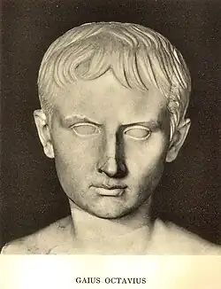 - Gaius Octavius:[5] (/ɒkˈteɪviəs/ ok-TAY-vee-əs; Latin: [ˈɡaːiʊs ɔkˈtaːwiʊs]). According to Suetonius, the cognomen Thurinus (Latin: [tʰuːˈriːnʊs], 'of Thurii') was added to his birth name as a toddler in 60 BC.[6][b] Later, after he had taken the name of Caesar, his rival Mark Antony referred to him as Thurinus in order to belittle him.[8][c] Marcus Junius Brutus, one of the assassins of Julius Caesar, referred to Octavian as Octavius, rejecting Octavian's claim to testamentary adoption.[10]