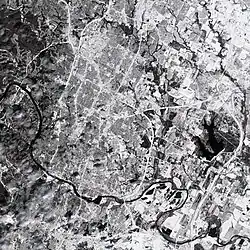 In 1860, 38% of Travis County residents were slaves.[41] In 1861, with the outbreak of the American Civil War, voters in Austin and other Central Texas communities voted against secession.[30][33] However, as the war progressed and fears of attack by Union forces increased, Austin contributed hundreds of men to the Confederate forces. The African American population of Austin swelled dramatically after the enforcement of the Emancipation Proclamation in Texas by Union General Gordon Granger at Galveston, in an event commemorated as Juneteenth. Black communities such as Wheatville, Pleasant Hill, and Clarksville were established, with Clarksville being the oldest surviving freedomtown ‒ the original post-Civil War settlements founded by former African-American slaves ‒ west of the Mississippi River.[33] In 1870, blacks made up 36.5% of Austin's population.[42]