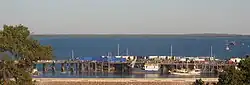 Filming in Kununurra was a gruelling experience for the cast and crew with temperatures soaring to 43 °C (109 °F) which, one day, caused Kidman to faint while on a horse.[22] In addition, she worked 14- and 15-hour days while dealing with morning sickness.[22] While shooting in a remote region of Western Australia, the shoot had to be rescheduled when the Faraway Downs set, the homestead central to the film's story, was reduced to mud from torrential rain – the first in 50 years.[23] The cast and crew went back to Sydney to shoot interior scenes until the expensive set dried out.[17] In addition, at one point, the entire country's horses were in lock down over equine flu.[6] Scenes using Darwin harbour were shot in July 2007, with parts of Stokes Hill Wharf blocked to the public and mini buses used to ferry tourists past the film set.[24] Exterior scenes set at Darwin's colonial Government House were shot in Vaucluse, Sydney, at the historic harbour-side property, Strickland House.[25]