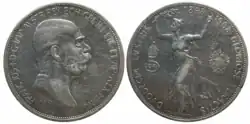Silver coin: 5 corona, 1908 – the bust of Franz Joseph I facing right surrounded by the abbreviated legend "FRANC[iscus] IOS[ephus] I, D[ei] G[ratia], IMP[erator] AUSTR[iae], REX BOH[emiae], GAL[iciae], ILL[yriae], ETC, ET AP[ostolicus] REX HUNG[ariae]"