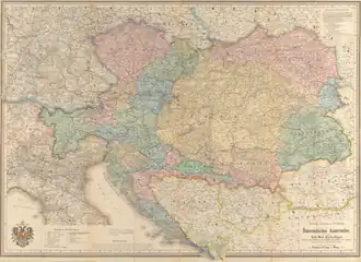 25. ^ Gesetz vom 19. Jänner 1853, RGBl. 10/1853: "Verordnung der Minister des Inneren, der Justiz und der Finanzen vom 19. Jänner 1853, womit die Allerhöchsten Entschließungen über die Einrichtung und Amtswirksamkeit der Bezirksämter, Kreisbehörden und Statthaltereien, über die Einrichtung der Gerichtsstellen und das Schema der systemisirten Gehalte und Diätenclassen, sowie über die Ausführung der Organisirung für die Kronländer Oesterreich ob und unter der Enns, Böhmen, Mähren, Schlesien, Galizien und Lodomerien mit Krakau, Bukowina, Salzburg, Tirol mit Vorarlberg, Steiermark, Kärnthen, Krain, Görz, Gradiska und Istrien mit Triest, Dalmatien, Kroatien und Slawonien, Siebenbürgen, die serbische Wojwodschaft mit dem Banate, kundgemacht werden". ÖNB-ALEX – Historische Rechts- und Gesetztexte Online (in German). 19 January 1853. Retrieved 5 July 2023.