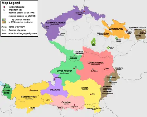 Provinces claimed by German Austria, with the subsequent border of the First Austrian Republic outlined in red