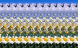 In 1844, David Brewster discovered the "wallpaper effect".[5] He noticed that when he stared at repeated patterns in wallpapers while varying his vergence, he could see them either behind the wall (with wall-eyed vergence) or in front of the wall (with cross-eyed vergence).[6] This is the basis of wallpaper-style autostereograms.[3]