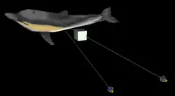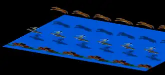 The following autostereogram shows three rows of repeated patterns. Each pattern is repeated at a different interval to place it on a different depth plane. The two non-repeating lines can be used to verify correct wall-eyed viewing. When the autostereogram is correctly interpreted by the brain using wall-eyed viewing, and one stares at the dolphin in the middle of the visual field, the brain should see two sets of flickering lines, as a result of binocular rivalry.[11]
