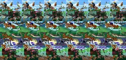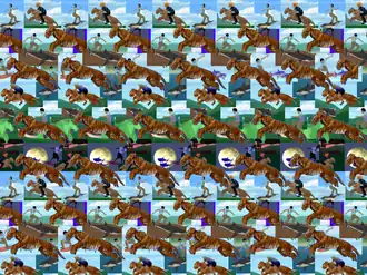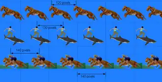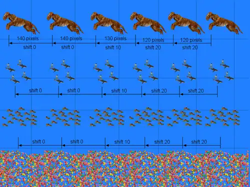 The 3D effects in the example autostereogram are created by repeating the tiger rider icons every 140 pixels on the background plane, the shark rider icons every 130 pixels on the second plane, and the tiger icons every 120 pixels on the highest plane. The closer a set of icons are packed horizontally, the higher they are lifted from the background plane. This repeat distance is referred to as the depth or z-axis value of a particular pattern in the autostereogram. The depth value is also known as Z-buffer value.