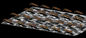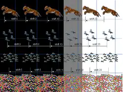 ) Click here for the 800 × 400 version When a series of autostereograms are shown one after another, in the same way moving pictures are shown, the brain perceives an animated autostereogram. If all autostereograms in the animation are produced using the same background pattern, it is often possible to see faint outlines of parts of the moving 3D object in the 2D autostereogram image without wall-eyed viewing; the constantly shifting pixels of the moving object can be clearly distinguished from the static background plane. To eliminate this side effect, animated autostereograms often use shifting background in order to disguise the moving parts.