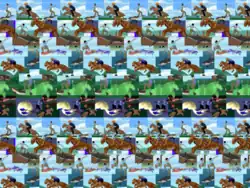 The wall-eyed depth map example autostereogram to the right encodes 3 planes across the x-axis. The background plane is on the left side of the picture. The highest plane is shown on the right side of the picture. There is a narrow middle plane in the middle of the x-axis. Starting with a background plane where icons are spaced at 140 pixels, one can raise a particular icon by shifting it a certain number of pixels to the left. For instance, the middle plane is created by shifting an icon 10 pixels to the left, effectively creating a spacing consisting of 130 pixels. The brain does not rely on intelligible icons which represent objects or concepts. In this autostereogram, patterns become smaller and smaller down the y-axis, until they look like random dots. The brain is still able to match these random dot patterns.