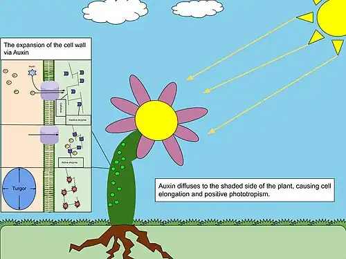 Auxin participates in phototropism, geotropism, hydrotropism and other developmental changes. The uneven distribution of auxin, due to environmental cues, such as unidirectional light or gravity force, results in uneven plant tissue growth, and generally, auxin governs the form and shape of the plant body, direction and strength of growth of all organs, and their mutual interaction.[6] When the cells grow larger, their volume increases as the intracellular solute concentration increases with water moving into the cells from extracellular fluid. This auxin-stimulated intake of water causes turgor pressure on the cell walls, causing the plant to bend.