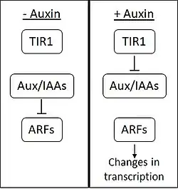 When a plant cell comes into contact with auxin, it causes dramatic changes in gene expression, with many genes up- or down-regulated. The precise mechanisms by which this occurs are still an area of active research, but there is now a general consensus on at least two auxin signalling pathways.[17][18]