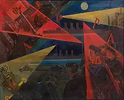 Political revolution has influenced both the topic and form in The Overthrow of the Autocracy, a Soviet avant-garde painting circa the Russian Revolution.