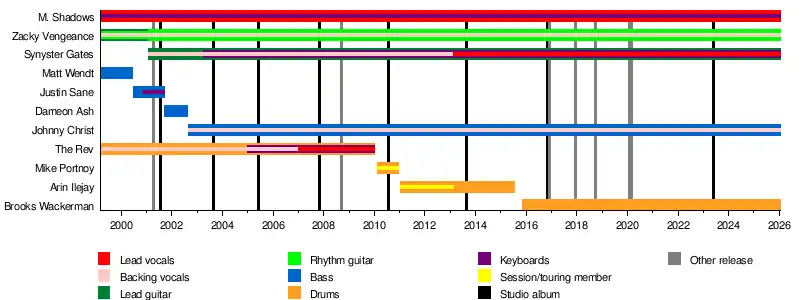 ![]() Avenged Sevenfold in 2016. From left to right: M. Shadows, Zacky Vengeance, Johnny Christ, Synyster Gates, and Brooks Wackerman | |