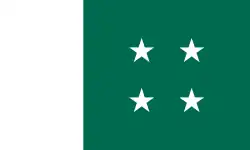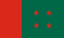 The Awami League party flag is a green field with four five-rayed red star at its centre, and a vertical red stripe at the hoist side. The flag also bears some resemblance to the flag of Pakistan, showing the ex-Pakistani origin of the Awami League. The four stars on the Flag represent the four fundamental principles of the party.