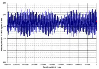 Long-term obliquity of the ecliptic. Left: for the past 5 million years; the obliquity varies only from about 22.0° to 24.5°. Right: for the next 1 million years; note the approx. 41,000-year period of variation. In both graphs, the red point represents the year 1850.[31]