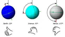 The positive pole of a planet is defined by the right-hand rule: if the fingers of the right hand are curled in the direction of the rotation then the thumb points to the positive pole. The axial tilt is defined as the angle between the direction of the positive pole and the normal to the orbital plane. The angles for Earth, Uranus, and Venus are approximately 23°, 97°, and 177° respectively.
