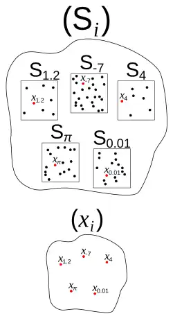 (Si) is an infinite indexed family of sets indexed over the real numbers R; that is, there is a set Si for each real number i, with a small sample shown above. Each set contains at least one, and possibly infinitely many, elements. The axiom of choice allows us to select a single element from each set, forming a corresponding family of elements (xi) also indexed over the real numbers, with xi drawn from Si. In general, the collections may be indexed over any set I, (called index set whose elements are used as indices for elements in a set) not just R.