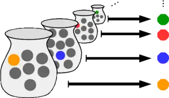 Illustration of the axiom of choice, with each set Si represented as a jar and its elements represented as marbles. Each element xi is represented as a marble on the right. Colors are used to suggest a functional association of marbles after adopting the choice axiom. The existence of such a choice function is in general independent of ZF for collections of infinite cardinality, even if all Si are finite.