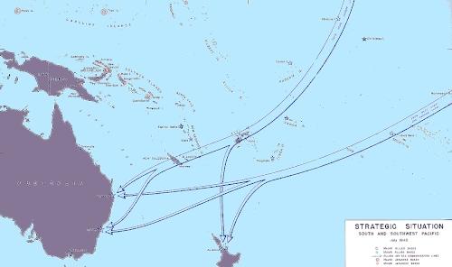 In March 1942, the Japanese military adopted a strategy of isolating Australia from the United States, which involved capturing Port Moresby in New Guinea, the Solomon Islands, Fiji, Samoa and New Caledonia.[46] This plan was frustrated by the Japanese defeat in the Battle of the Coral Sea and was postponed indefinitely after the Battle of Midway.[47]