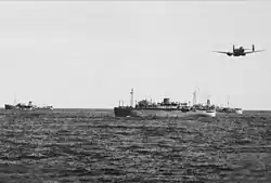 The defence of the Australia Station was the Royal Australian Navy's (RAN) main concern throughout the war.[3] Although RAN ships frequently served outside Australian waters, escort vessels and minesweepers were available to protect shipping in the Australia Station at all times. These escorts were supported by a small number of larger warships, such as cruisers and armed merchant cruisers, for protection against surface raiders.[4] Important military shipping movements were escorted from the start of the war, but convoys were not instituted in Australian waters until June 1942.[5] The Australian naval authorities did, however, close ports to shipping at various times following real or suspected sightings of enemy warships or mines prior to June 1942.[6]
