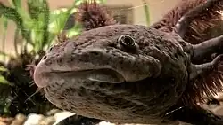 The axolotl (/ˈæksəlɒtəl/ ⓘ; from Classical Nahuatl: āxōlōtl [aːˈʃoːloːtɬ] ⓘ) (Ambystoma mexicanum) is a species of paedomorphic mole salamander. They mature into the terrestrial adult form without undergoing metamorphosis; the adults remain fully aquatic with obvious external gills. This trait, although somewhat unusual among the majority of amphibians, is not unique. Axolotls may be difficult to distinguish from the larval stage of other neotenic adult mole salamanders, such as mudpuppies (Necturus spp.) or the occasionally paedomorphic tiger salamander (A. tigrinum).[4]