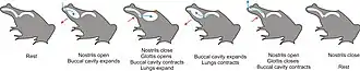Axolotls have barely visible vestigial teeth; other salamanders only develop these during metamorphosis. Their primary method of feeding is by suction, during which their rakers interlock to close the gill slits. Axolotls use their external gills for respiration; buccal pumping (gulping air from the surface) may also be used to provide oxygen to their lungs.[14] Buccal pumping can occur in a two-stroke manner that pumps air from the mouth to the lungs or a four-stroke manner which reverses this pathway using compression forces.
