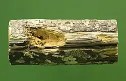 It is the world's largest nocturnal primate.[4] It is characterized by its unusual method of finding food: it taps on trees to find grubs, then gnaws holes in the wood using its forward-slanting incisors to create a small hole into which it inserts its narrow middle finger to pull the grubs out. This foraging method is called percussive foraging, and takes up 5–41% of foraging time.[5][6] The only other living mammal species known to find food in this way are the striped possum and trioks (genus Dactylopsila) of northern Australia and New Guinea, which are marsupials.[7] From an ecological perspective, the aye-aye fills the niche of a woodpecker, as it is capable of penetrating wood to extract the invertebrates within.[8][9]
