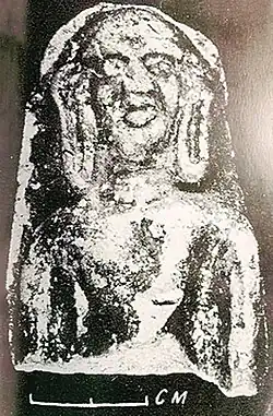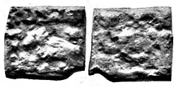 Nevertheless, Saketa appears to have remained a prosperous town during the Kushan rule.[53] The second century geographer Ptolemy mentions a metropolis "Sageda" or "Sagoda", which has been identified with Saketa.[49] The earliest inscription that mentions Saketa as a place name is dated to the late Kushan period: it was found on the pedestal of a Buddha image in Shravasti, and records the gift of the image by Sihadeva of Saketa.[52] Before or after the Kushans, Saketa appears to have been ruled by a dynasty of kings whose names end in "-mitra", and whose coins have been found at Ayodhya. They may have been members of a local dynasty that was distinct from the Mitra dynasty of Mathura. These kings are attested only by their coinage: Sangha-mitra, Vijaya-mitra, Satya-mitra, Deva-mitra, and Arya-mitra; coins of Kumuda-sena and Aja-varman have also been discovered.[54]