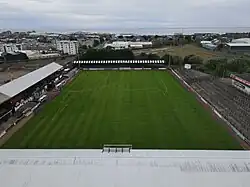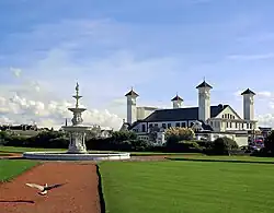 The Burgh of Ayr Act 1873 resulted in Newton and Wallacetown being absorbed into the Burgh of Ayr.[9][14] Newton's more industrial character has left the town today divided into two distinct areas, with areas south of the River Ayr incorporating a mixture of affluent Victorian residential suburbs and modern suburban developments, in contrast to more deprived and industrial areas to the north of the river.[24] When elected county councils were created in 1890 under the Local Government (Scotland) Act 1889, the burgh of Ayr was deemed capable of running its own affairs and so was excluded from the jurisdiction of Ayrshire County Council, although the county council chose to meet at County Buildings in the town.[25][26] The Carnegie Library was opened in Ayr on 2 September 1893. By the turn of the century, Ayr's population was around 31,000 people.[11] The Burns Statue Square drill hall was completed in 1901[27] and the Wellington Square drill hall was probably completed shortly after that.[28]