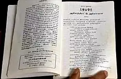 The holy books of Ayyavazhi are the Akilattirattu Ammanai (commonly referred to as Akilam)[51] and the Arul Nool, and they are the source of the religion's mythology. The Akilattirattu Ammanai was written by Hari Gopalan Seedar in 1841,[52] as if hearing the contents of Akilam told by Narayana to his consort Lakshmi.[53] In addition to the mythological events Akilam also provides an extensive quantity of historical facts,[54] especially that of mid and late 2nd millennium CE. While the original text is damaged, the daughter versions such as the Swamithope version, the Kottangadu version as well as the Panchalankurichi versions, are the earliest existing palm-leaf versions of Akilam.[55] Other released versions includes the Sentrathisai Ventraperumal, the Vivekanandan, the highly criticised VTV[55] and the earliest and commonly accepted Palaramachandran version.[55] Akilam contains more than 15,000 verses in seventeen sections. It is written in poetic Tamil in a ballad form, and is composed with a unique literal-style with two subgenres, Viruttam and Natai throughout.