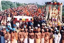 There are two yearly festivals for Ayyavazhi. The Ayya Vaikunda Avataram is celebrated on the twentieth day of the Tamil month Masi (Feb – March). This is the only Ayyavazhi festival to be celebrated as per the Solar calendar.[149] The mass procession conducted on this day from Nagercoil to Swamithoppe is a popular one in this part of the country.[150] The Thiru Edu-Vasippu is a festival of seventeen days celebrated in the Tamil month of Karthigai (November–December).[151] This celebration of textual reciting as a festival itself is a unique feature to Ayyavazhi. Apart from this, there is a tri-yearly celebration of Kodiyettru Thirunal in Swamithope. Another unique feature is the celebration of every day as a festival in Swamithope,(exclusive to Swamithope) called as 'Nitham Thirunal' .[152]