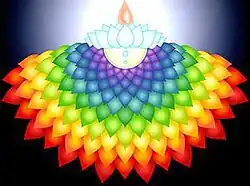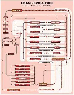 The mythical narration in akilam about the eight yugas is often viewed philosophically as a reference to eight chakras.[72] The first, Neetiya Yukam, is Bindu and the final state, Dharma Yukam, is Sahasrara, or absolute bliss. In this series, the energy of consciousness (namam) of oneself is invoked, rising from Bindu (Neetiya Yukam) to the final Sahasrara (Dharma Yukam). This lotus, the highest spiritual center of enlightenment, is for experiencing the absolute "bliss".[73] The reigning power in the final Dharma Yukam (Sahasrara) is Ekam, which is a part of Vaikundar a Trinity conception, or a manifestation of the supreme absolute.[68]