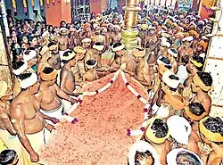 In addition to the philosophical concepts and mythology, the rituals of Ayyavazhi evolved in their own way. Most of the rituals have different operational and historical meanings.[153] Historically, the rituals were used or viewed as an attempt to break the caste-based inequalities prevailed in the society of the time, and to strengthen and uplift the sociologically downtrodden and ill-treated. Examples of this include the charity on food as 'Anna Dharmam' , physical as well as spiritual cleanliness through Thuvayal Thavasu,[154] eliminating untouchability through Thottunamam, self-respect and courage through headgear,[155] and unifying various castes through Muthirikkinaru.[156]