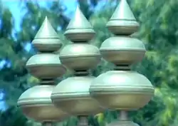 Ayyavazhi architecture was developed in constructing Nizhal Thangals, where the inverted lotus flower of Sahasrara is used to cover the roof.[75] The lotus may also represent the heart and the flame shape (Thirunamam), the divinity.[76] Ayyavazhi has used other symbols including Vaishnavite ' Triple Namam '(not used currently), and Conch.