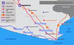 To the Ayyavazhi devotees, there are seven holy places, called Pathis,[59][60] with the Pancha pathis being the most important.[61] The temple of the Swamithope pathi is the headquarters of the Ayyavazhi.[62][63][64]