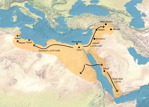 ![]() Ayyubid Sultanate of Egypt (in pink) at the death of Saladin in 1193 | |||||||||||||||||||||||||||||||||