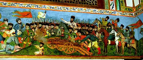 Thereafter, the area was under the successive rule of the Iranian Zands and Qajars.[76] From the late 18th century, Imperial Russia switched to a more aggressive geo-political stance towards Iran and the Ottoman Empire.[77] Russia actively tried to gain possession of the Caucasus region which was, for the most part, in the hands of Iran.[78] In 1804, the Russians invaded and sacked the Iranian town of Ganja, sparking the Russo-Persian War of 1804–1813.[79] The militarily superior Russians ended the war with a victory.[80] Following Qajar Iran's loss, it was forced to concede suzerainty over most of the khanates, along with Georgia and Dagestan to the Russian Empire, per the Treaty of Gulistan.[81]