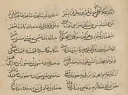 The development of Azerbaijani literature is closely associated with Anatolian Turkish, written in Perso-Arabic script. Examples of its detachment date to the 14th century or earlier.[28][29] Kadi Burhan al-Din, Hasanoghlu, and Imadaddin Nasimi helped to establish Azerbaiijani as a literary language in the 14th century through poetry and other works.[29] One ruler of the Qara Qoyunlu state, Jahanshah, wrote poems in Azerbaijani language with the nickname "Haqiqi".[30][31] Sultan Yaqub, a ruler of the Aq Qoyunlu state, wrote poems in the Azerbaijani language.[32] The ruler and poet Ismail I wrote under the pen name Khatā'ī (which means "sinner" in Persian) during the fifteenth century.[9][33] During the 16th century, the poet, writer and thinker Fuzûlî wrote mainly in Azerbaijani but also translated his poems into Arabic and Persian.[9]