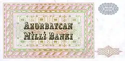 The Azerbaijan Democratic Republic and its successor, the Azerbaijani Soviet Socialist Republic issued their own currency between 1919 and 1923. The currency was called the manat (منات) in Azerbaijani and the ruble (рубль) in Russian, with the denominations written in both languages (and sometimes also in French) on the banknotes. The manat replaced the first Transcaucasian ruble at par, and was replaced by the second Transcaucasian ruble after Azerbaijan became part of the Transcaucasian Soviet Federal Socialist Republic. No subdivisions were issued, and the currency only existed as banknotes.
