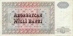 10 manats | brown | inscription «AZƏRBAYCAN MİLLİ BANKI» | 1992 | ||