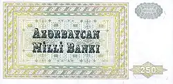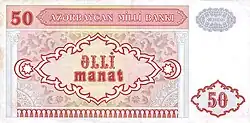 50 manats | red, grey | inscription «AZƏRBAYCAN MİLLİ BANKI» and denomination «ƏLLİ manat» | 1993, 1999 | ||