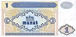 yellow, blue | inscription «AZƏRBAYCAN MİLLİ BANKI» and denomination «BİR manat» | 1993 | |||