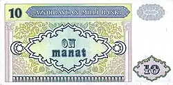 teal | inscription «AZƏRBAYCAN MİLLİ BANKI» and denomination «ON manat» | 1993 | |||